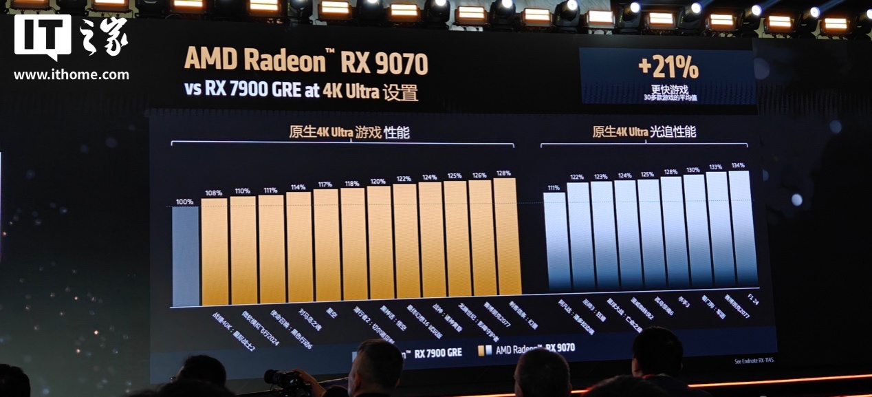 性能表现上官方表示,AMD Radeon RX 9070 显卡在 4K Ultra 画质设置的主流游戏中,相比 RX 7900 GRE 平均性能提升达到了 21%;其中光栅游戏性能最高提升 28%,光追游戏性能最高提升 34%;