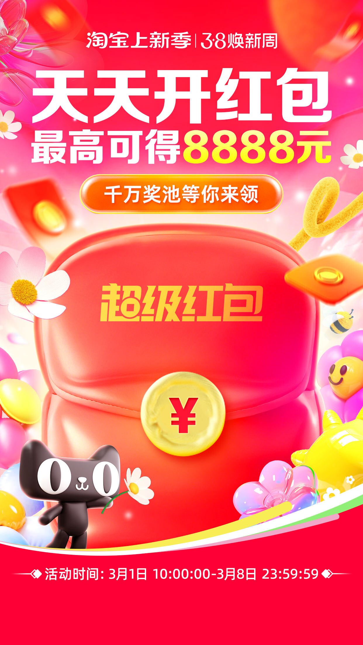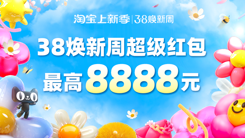 天猫 38 超级红包将在 3 月 1 日周六 10:00 正式开抢,面额至高 8888 元,下单直接当钱花哦:点此抽红包。
