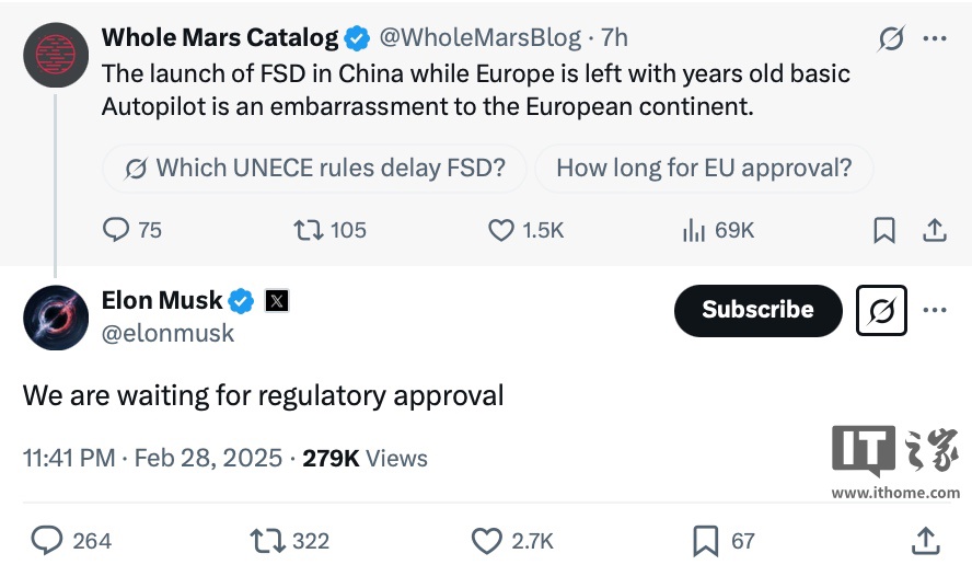 IT之家注意到,特斯拉 CEO 埃隆・马斯克发文对此进行解释,声称该公司正在等待欧洲的监管部门批准,具体批准时间仍未确定,特斯拉和欧洲监管机构正在就此事进行沟通。