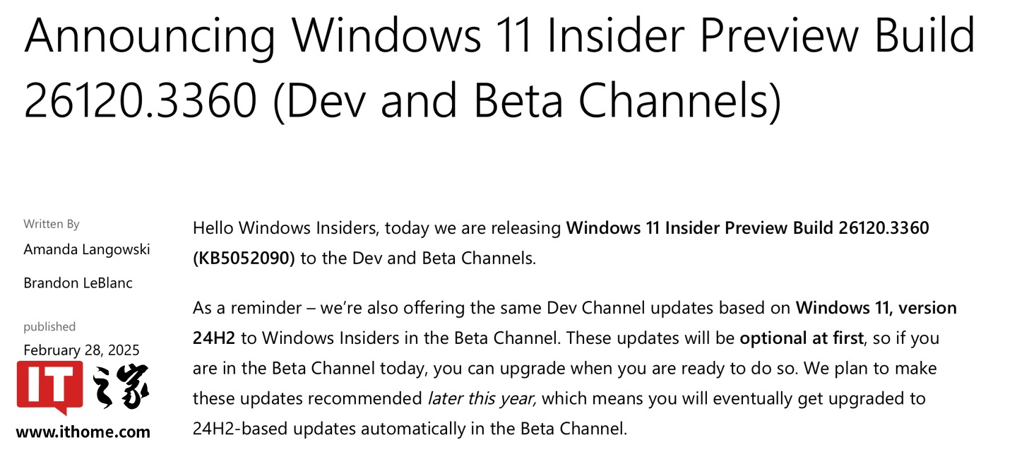 IT之家 3 月 1 日消息,微软公司今天面向 Dev 和 Beta 频道的 Windows Insider 项目成员发布了 Windows 11 KB5052090 更新,用户安装后版本号升至 Build 26120.3360。