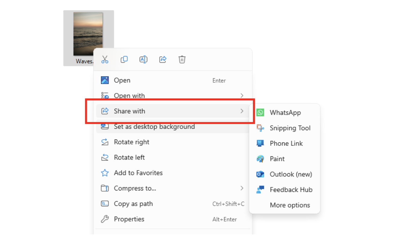 现在用户在文件资源管理器或桌面上右键单击本地文件时,可以直接分享到支持共享功能的 Windows 应用中。