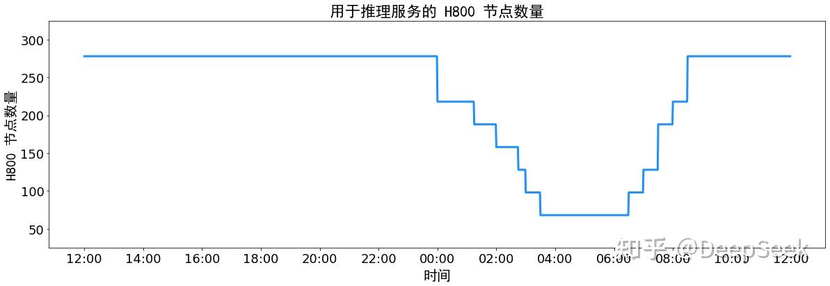 DeepSeek V3 和 R1 的所有服务均使用 H800 GPU,使用和训练一致的精度,即矩阵计算和 dispatch 传输采用和训练一致的 FP8 格式,core-attention 计算和 combine 传输采用和训练一致的 BF16,最大程度保证了服务效果。另外,由于白天的服务负荷高,晚上的服务负荷低,因此 DeepSeek 实现了一套机制: