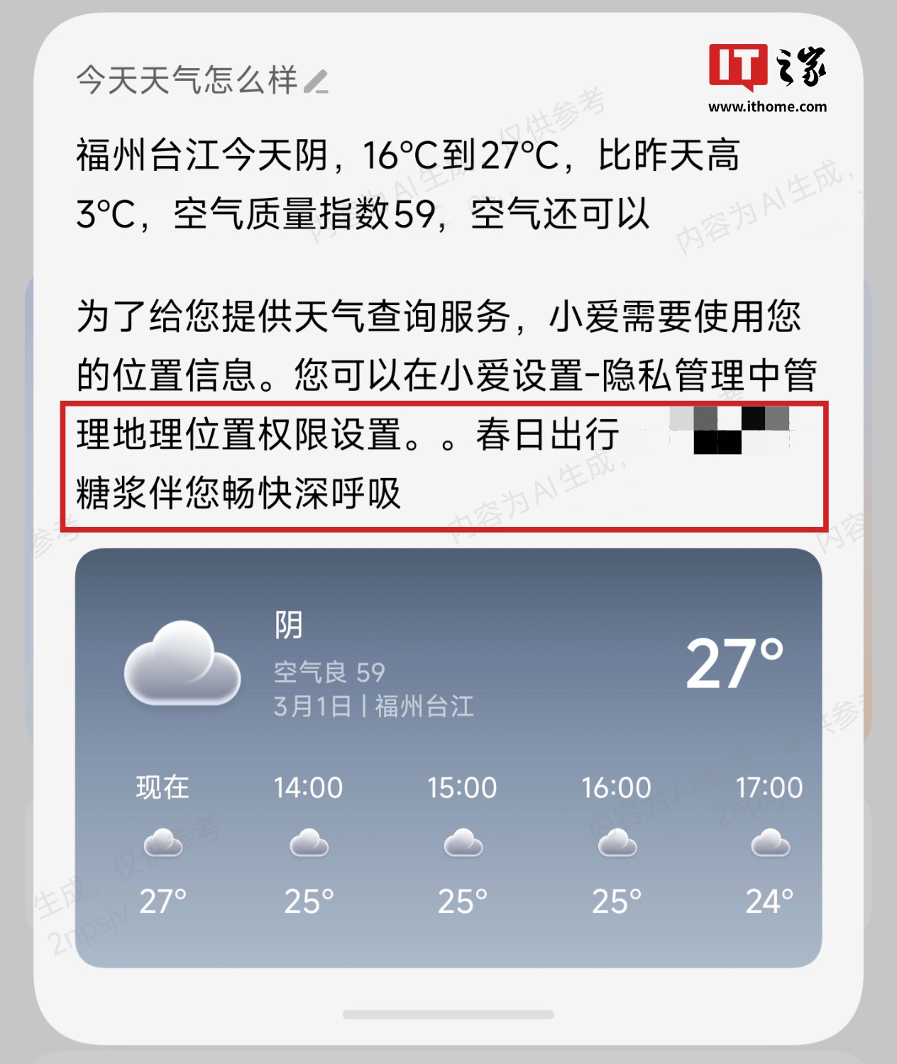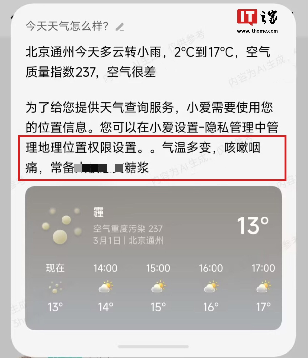 IT之家 3 月 1 日消息,综合读者反馈并经IT之家测试,小米超级小爱悄悄添加了天气方面的广告内容,在询问超级小爱“今天天气怎么样”时,会随机触发(一段时间仅触发一次)广告回复,显示为“气温多变,咳嗽咽痛,常备 XXXX 糖浆”、“XXXX 糖浆伴你畅快深呼吸”等。