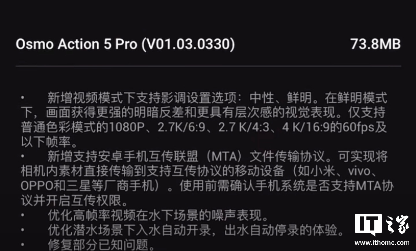 大疆现在为这款运动相机推送了最新的 v01.03.0330 版本固件,宣布支持安卓手机互传联盟(MTA)文件传输协议,其他影像设备将陆续适配。