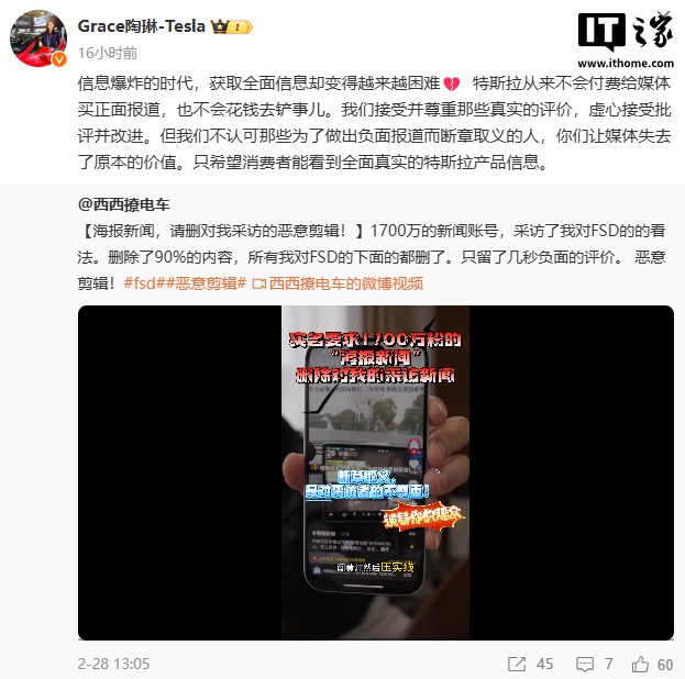 IT之家 3 月 1 日消息,昨日有网友称有媒体采访他对 FSD 的看法,删除了 90% 的内容,只留了几秒负面的评价。