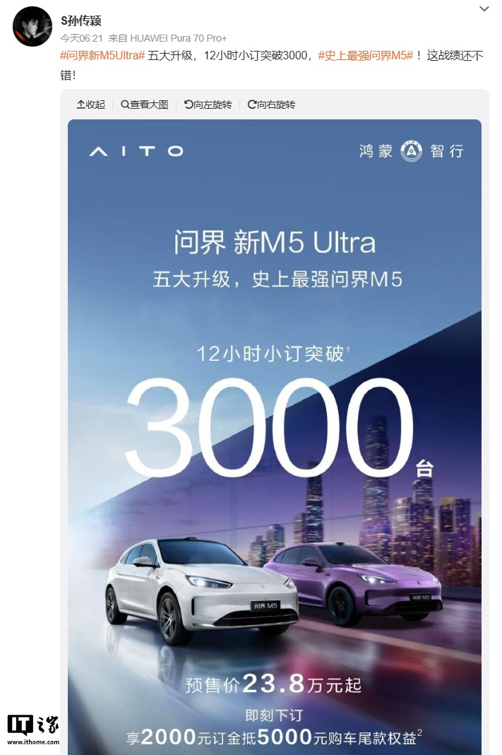 IT之家 3 月 2 日消息,鸿蒙智行问界新 M5 Ultra 昨日起开启预订,预售价 23.8 万元起。据多位微博用户 / 博主分享,新车 12 小时小订突破 3000 台。