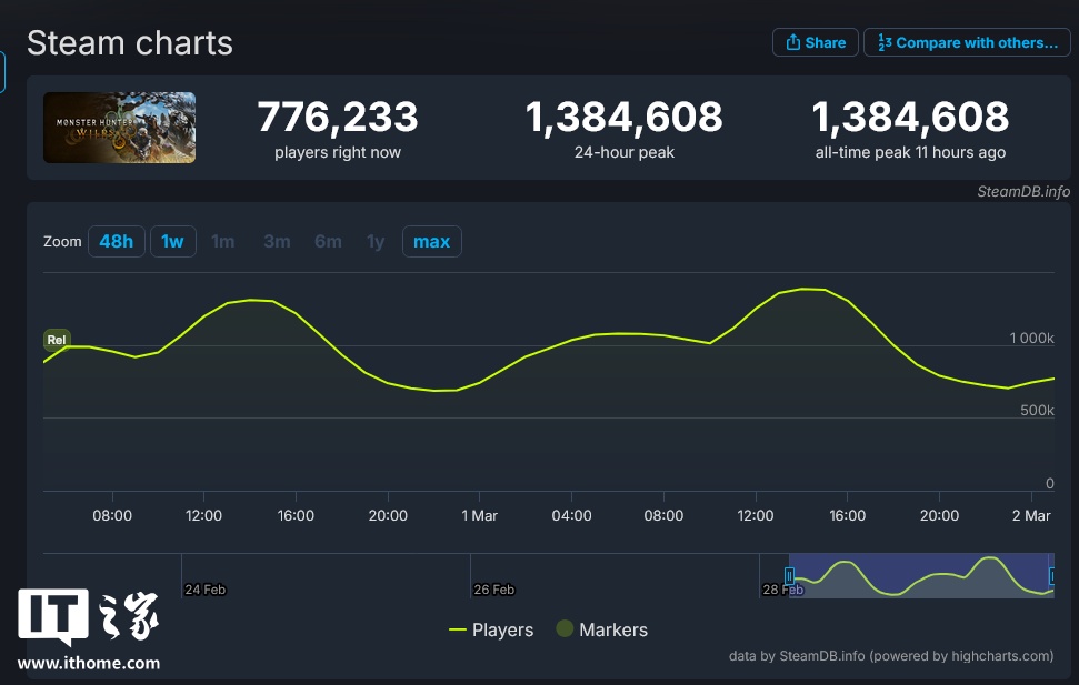 IT之家 3 月 2 日消息,根据 SteamDB 数据,《怪物猎人:荒野》游戏在 2 月 28 日上线首日,Steam 平台同时在线玩家数峰值达到 1307976 人。