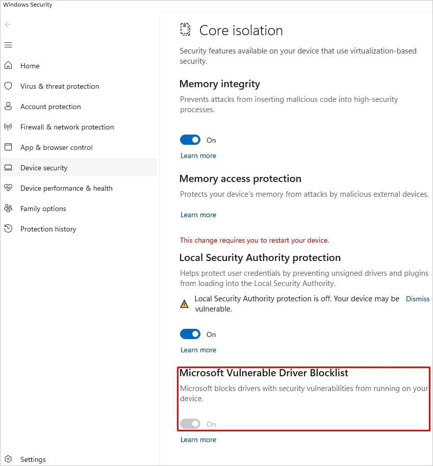 微软推荐 Windows 10、Windows 11 用户启用此功能,路径为设置 → 隐私和安全性 → Windows 安全中心 → 设备安全性 → 内核隔离 → Microsoft 易受攻击的驱动程序阻止列表。