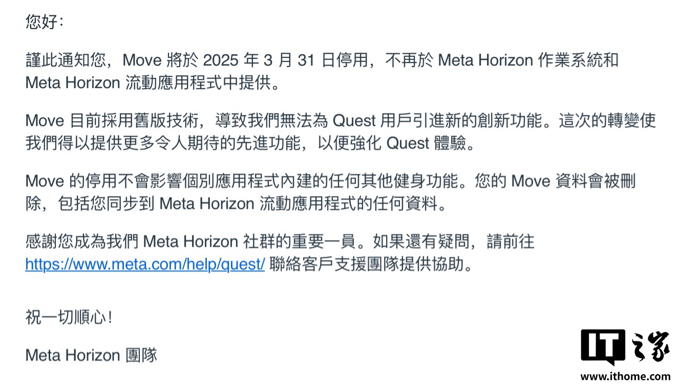 IT之家 3 月 2 日消息,Meta 向旗下 Quest 用户发送邮件,宣布旗下 Quest 头显内置的 Meta Quest Move 运动最终应用将于 3 月 31 日停用。