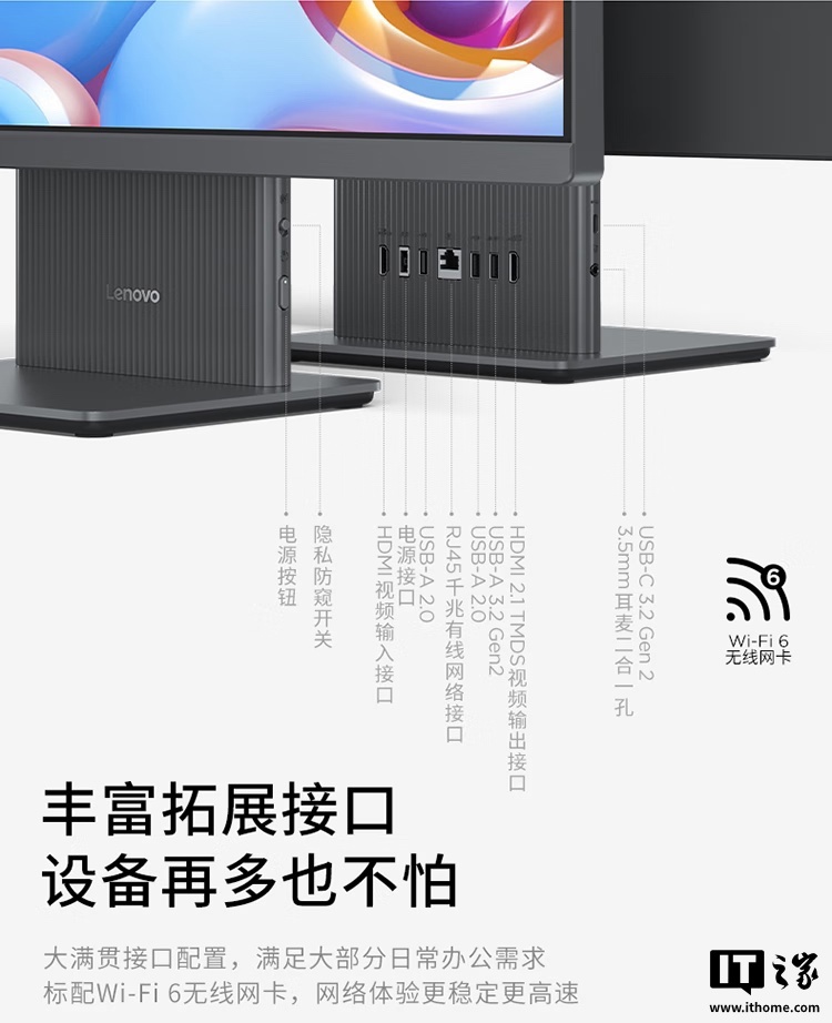 该机继承了家族式简约设计,可选黑白双色,配备 Harman 2.0 立体声音响、语音降噪双麦克风,支持莱茵低蓝光及无频闪认证,支持 Wi-Fi 6 无线网络,支持 HDMI-in 及 HDMl-out,运行噪音不高于 26dB(A)。