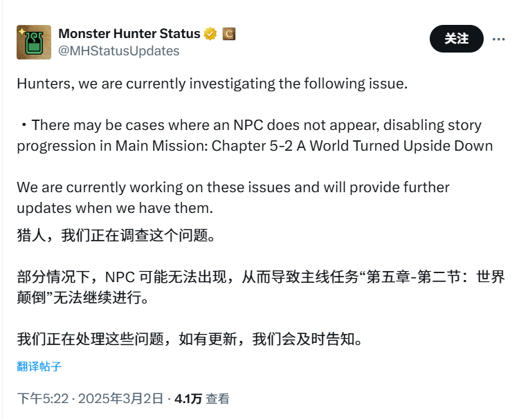 卡普空昨日发布声明称:“猎人们,我们正在调查以下问题。部分情况下,NPC 未出现,导致主线任务第 5 章第 2 节的剧情无法推进。我们正在解决这一问题,并将在有新进展时向大家更新。”