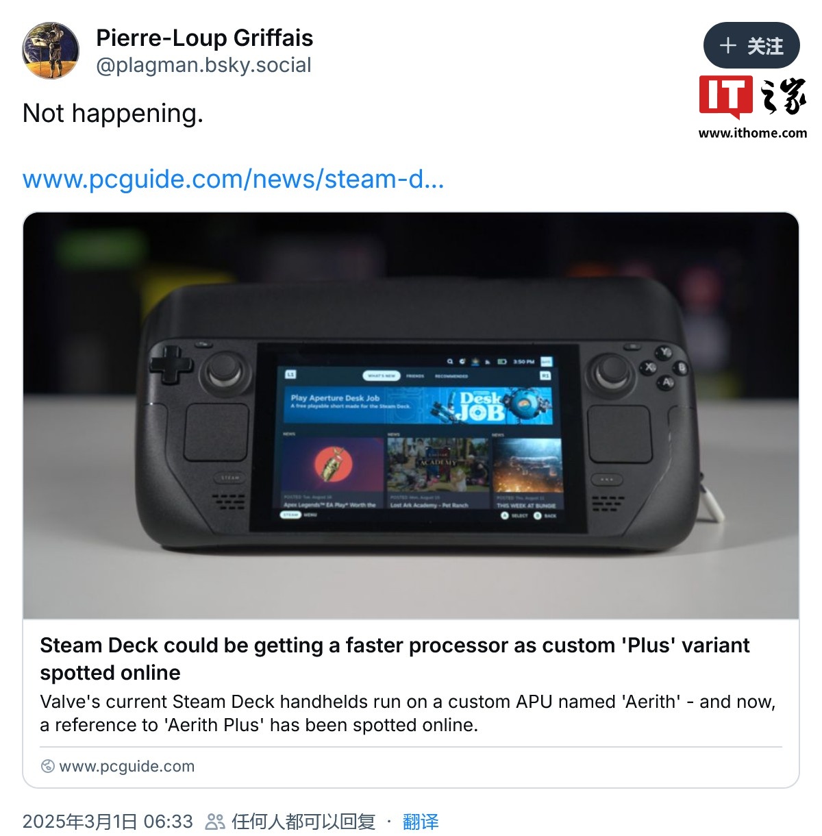 V社 Steam Deck 团队员工 Pierre-Loup Griffais 在 Bluesky 平台表示,Valve 并未在开发基于 "Aerith Plus" 的 Steam Deck 掌机改款(此前已有基于 6nm "Sephiroth" SoC 的 Steam Deck OLED)。