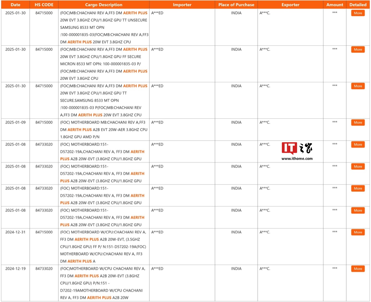 IT之家 3 月 3 日消息,X 平台消息人士 Everest (@Olrak29_) 注意到,第三方海关信息数据库 NBD 记录到了多条有关 AMD "Aerith Plus" 处理器的信息。