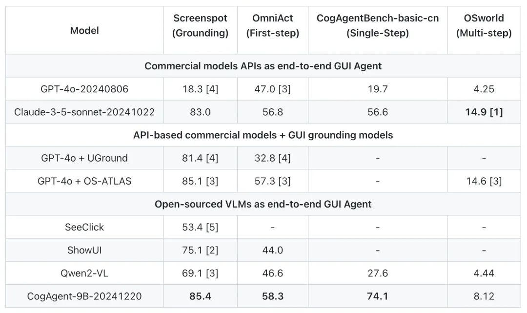 CogAgent-9B-20241220 在 Screenspot、OmniAct、CogAgentBench-basic-cn 和 OSWorld 等数据集上进行了测试,并与 GPT-4o-20240806、Claude-3.5-Sonnet、Qwen2-VL、ShowUI、SeeClick 等模型进行了比较。