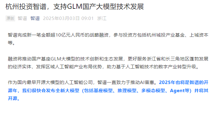 IT之家 3 月 3 日消息,北京智谱华章科技有限公司今日宣布完成新一笔金额超 10 亿元人民币的战略融资,参与投资方包括杭州城投产业基金、上城资本等。