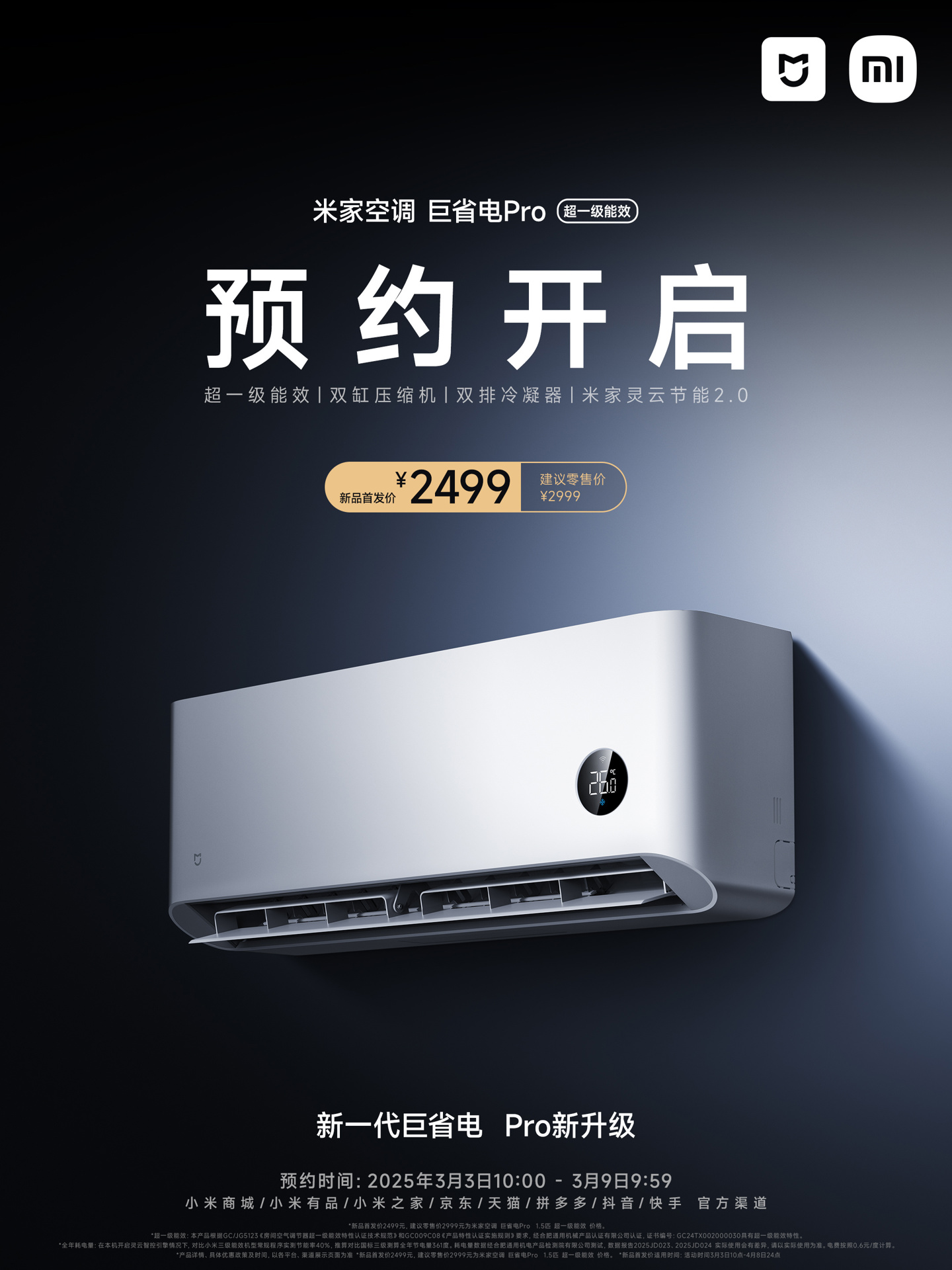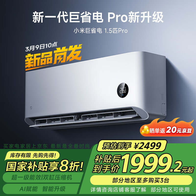 IT之家 3 月 3 日消息,据小米智能生态官微,2025 款米家空调巨省电 Pro 今起开启预约,1.5 匹到售价为 2499 元。其支持超一级能效,APF5.65,全年省电约 361 度。