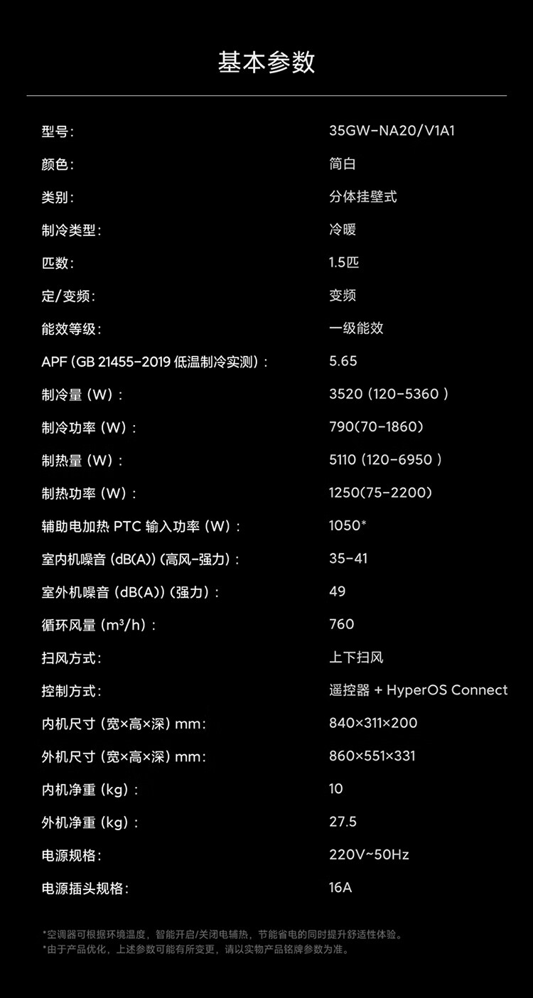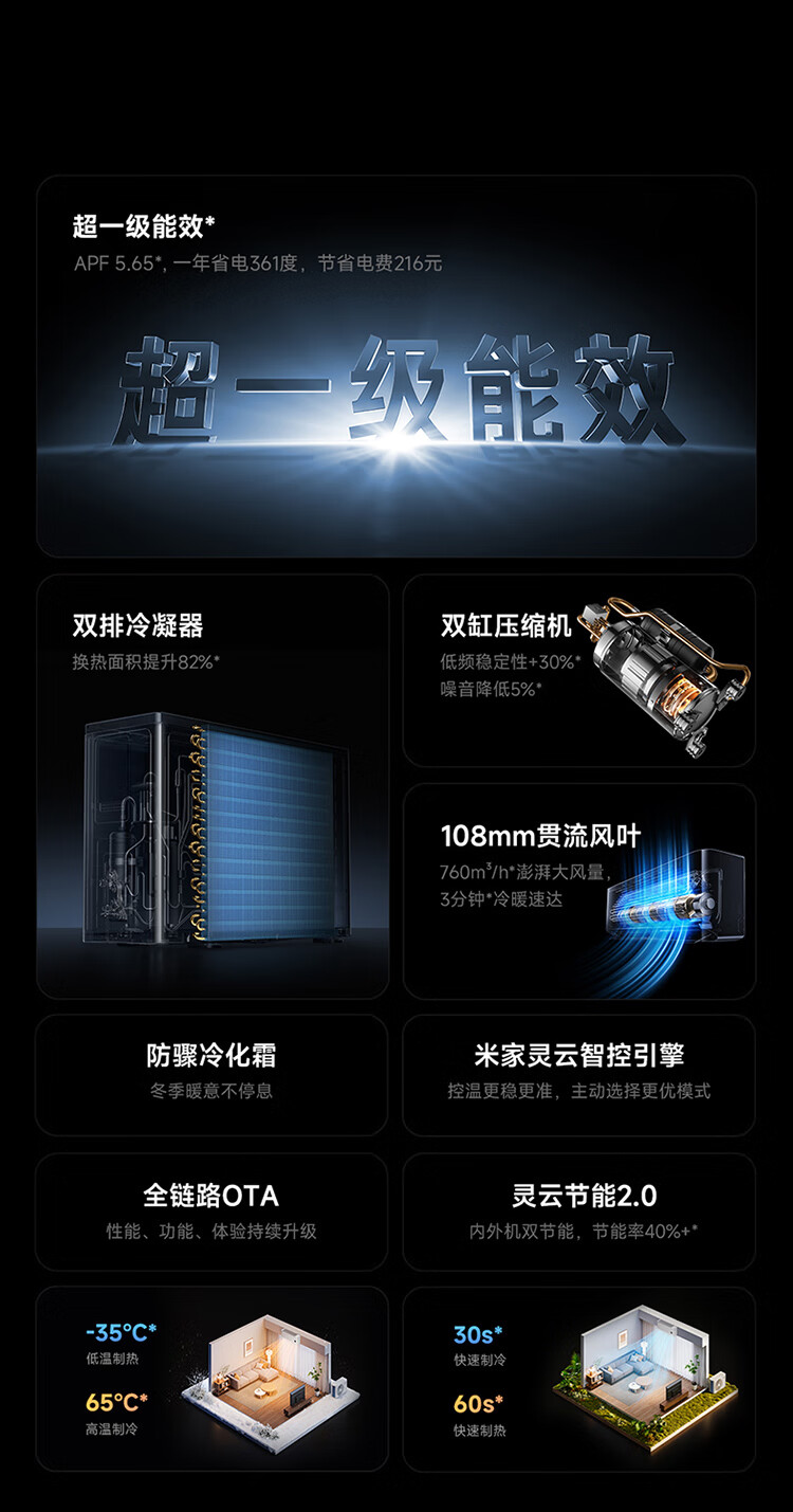 该空调内置米家灵云智控引擎,可智能检测内外机工作环境,节能率提升幅度超过 40%。同时,其具有自研全新风道,噪音低至 18dB;支持 30 秒速冷 / 60 秒速热,可在-35℃环境下制热、65℃环境下制冷。