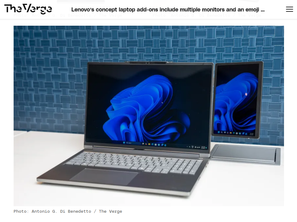 Magic Bay Dual Display Concept 是一个双屏配件,包含两个 13.3 英寸屏幕,可以挂载到 ThinkBook 16p Gen 6 上。
