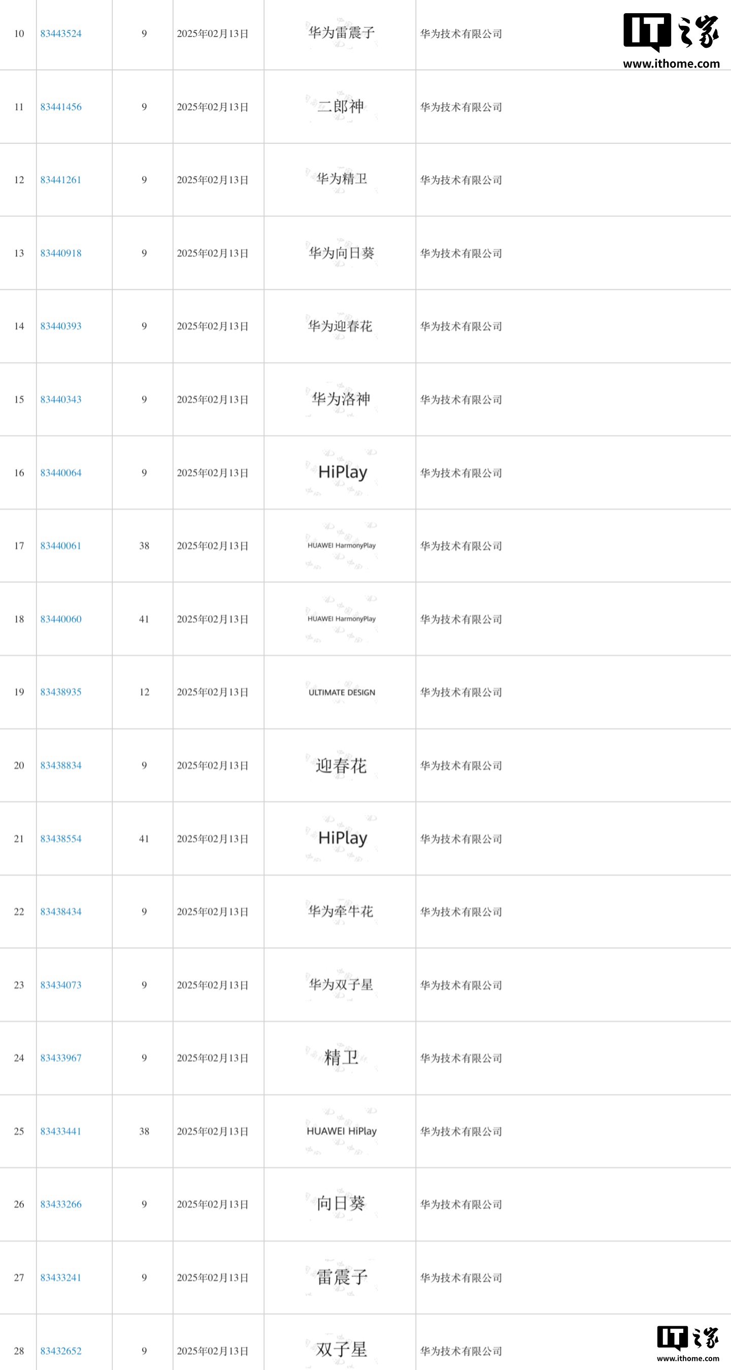 此外,华为技术有限公司近期还申请注册“华为洛神”、“华为精卫”、“精卫”、“二郎神”、“雷震子”等神话人物商标及“华为牵牛花”、“双子星”、“迎春花”、“向日葵”等商标,当前商标状态同样为“等待实质审查”。