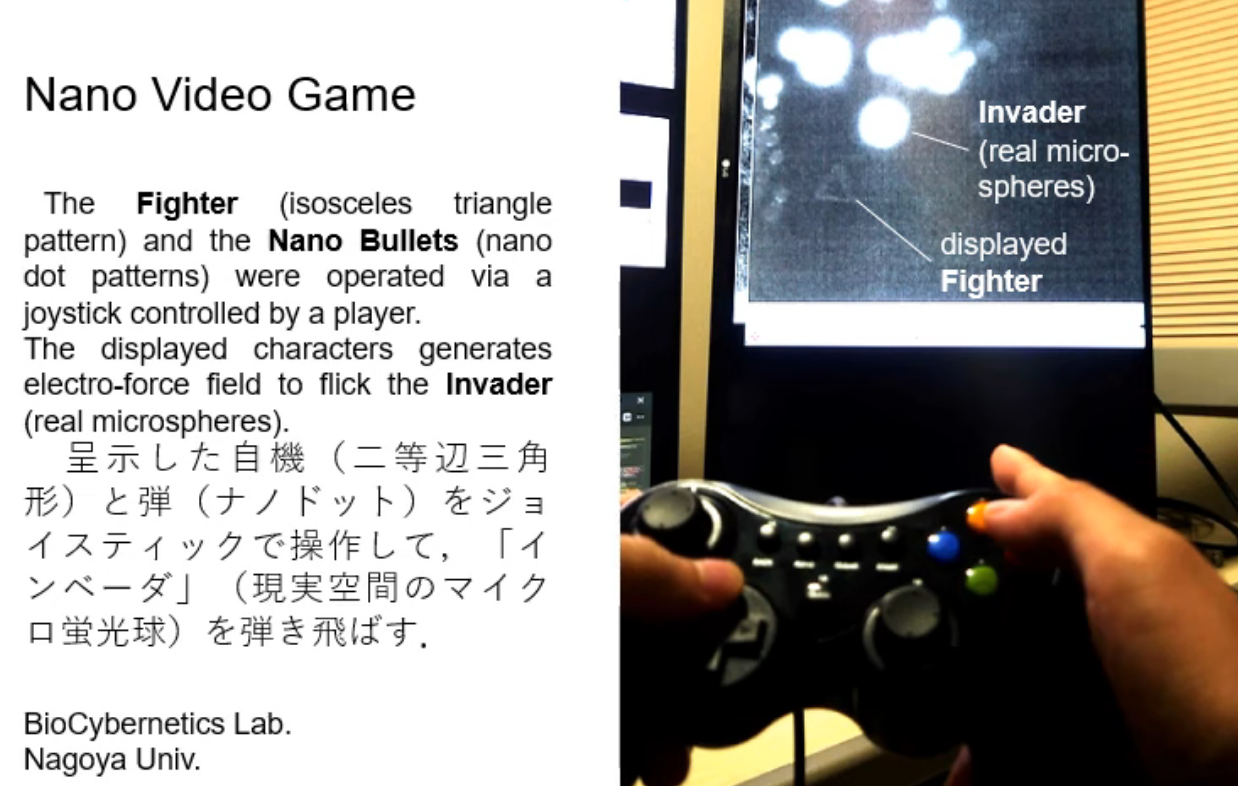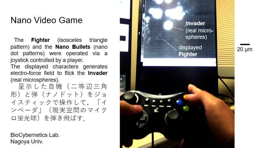 该游戏基于“纳米混合现实”技术,玩家可以使用游戏手柄控制一艘微小的三角形“飞船”,发射纳米级的子弹,将几微米直径的物理聚苯乙烯小球推开。