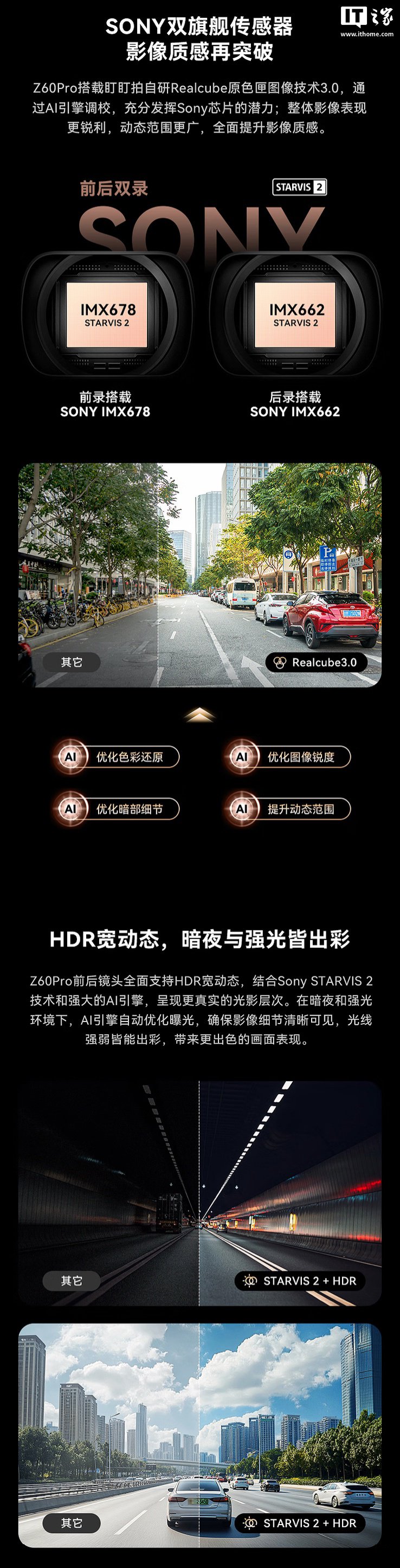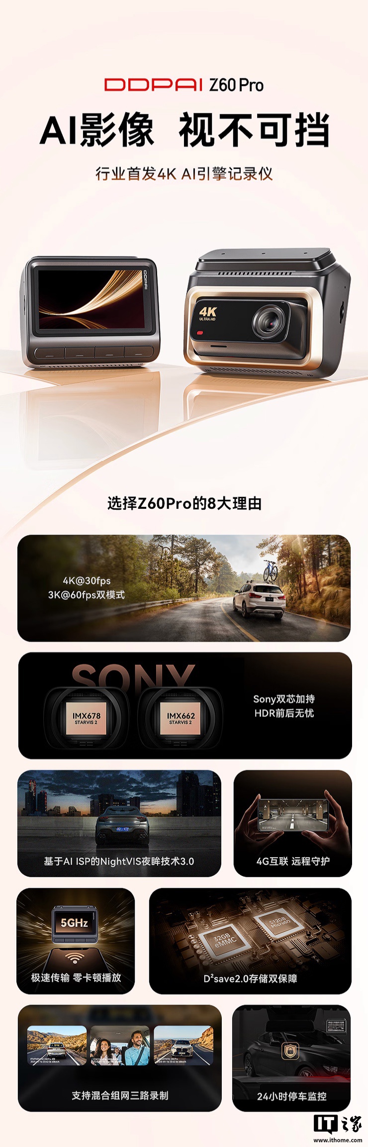 据介绍,这款行车记录仪配备索尼 IMX678 和 IMX662 影像传感器,支持 4K30FPS、3K60FPS、1080P60FPS 视频录制,支持 24 小时停车监控,内置 4G 互联技术。
