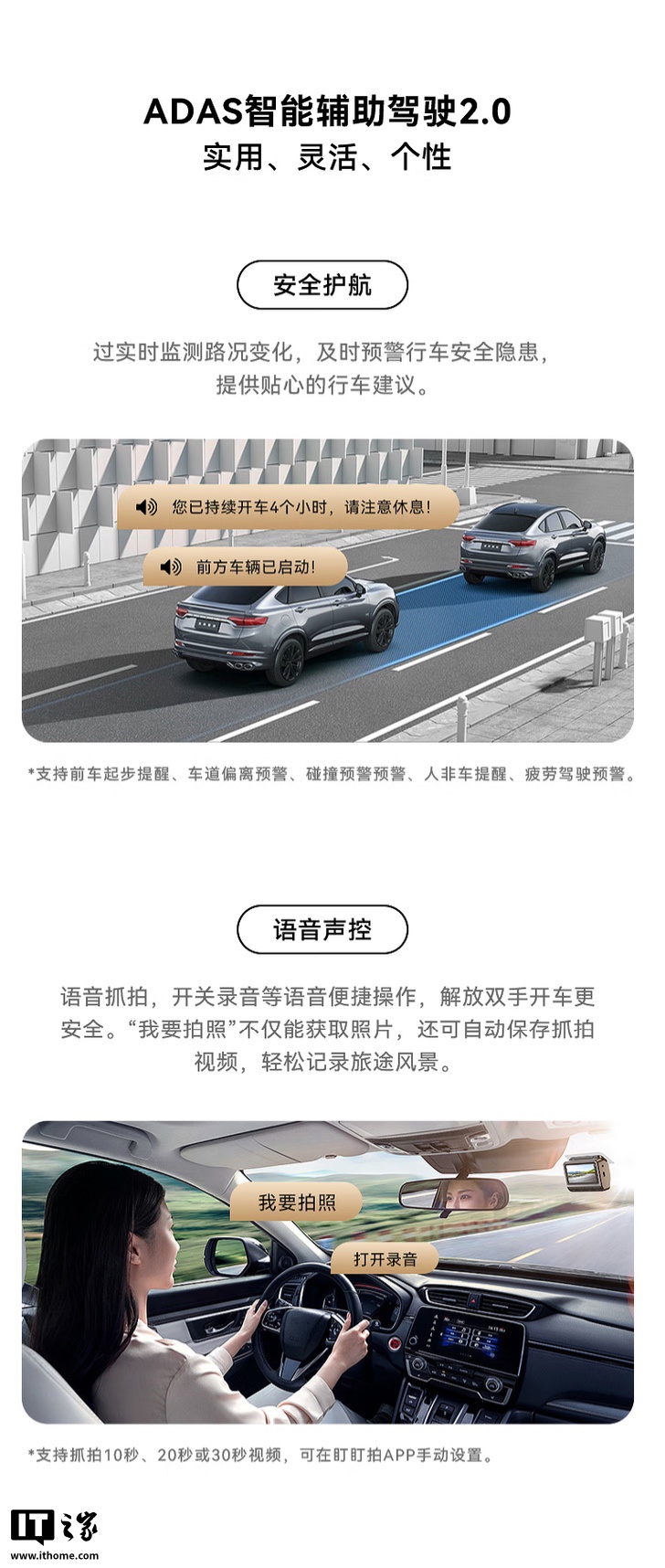 此外,该行车记录仪还搭载 ADAS 辅助驾驶 2.0 技术,基本上就是一个基于视觉识别的语音助理,支持提醒前车起步、车道偏离、碰撞预警等。