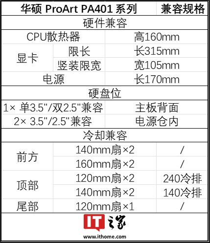 ▲ 木艺铁韵版(左)和木艺版(右)华硕 PA401 系列机箱三维宽深高 225×412×503 (mm),体积 46.63L;其具备 7 条 PCIe 扩展槽,支持 ATX 主板,属于中塔规格。该机箱硬件兼容性如下: