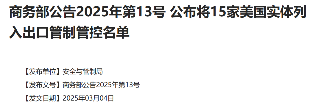 IT之家 3 月 4 日消息,商务部今日(4 日)发布公告,根据《中华人民共和国出口管制法》和《中华人民共和国两用物项出口管制条例》等法律法规有关规定,为维护国家安全和利益,履行防扩散等国际义务,决定将莱多斯公司等 15 家美国实体列入出口管制管控名单,并采取以下措施: