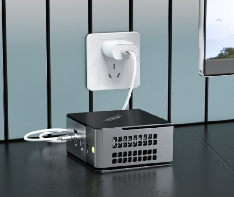 外观方面,该机采用“悬浮风格”设计,即迷你主机上下支架由一张铝合金面板弯折而成,主体与上下支架间配有灯效。
