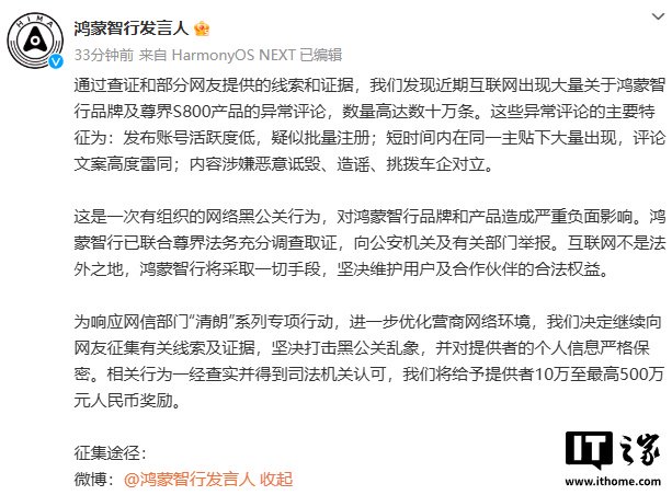 “鸿蒙智行发言人”官方微博 3 月 2 日晚发文向网友征集有关线索及证据,坚决打击黑公关乱象,并对提供者的个人信息严格保密。相关行为一经查实并得到司法机关认可,将给予提供者 10 万至最高 500 万元人民币奖励。