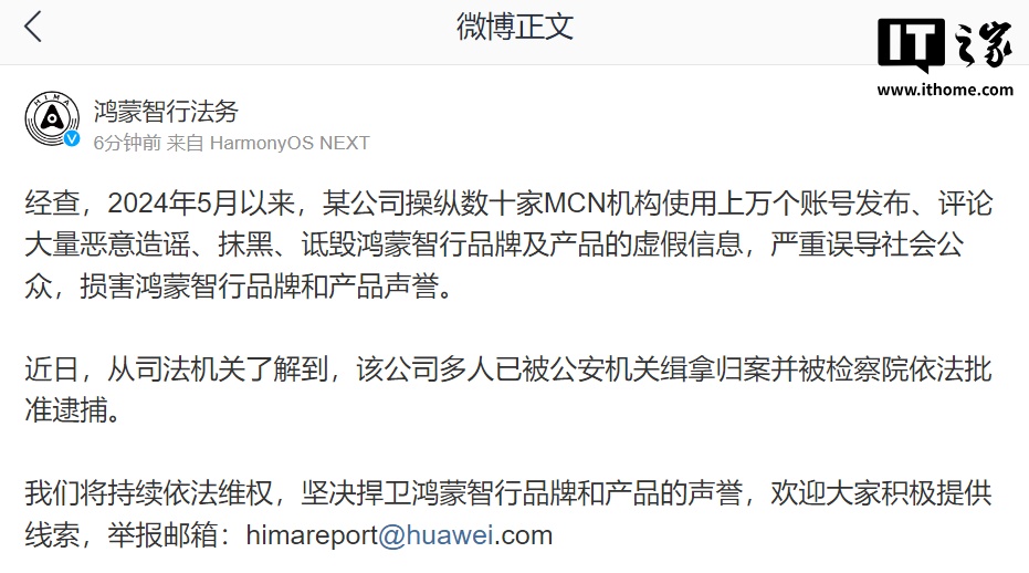 我们将持续依法维权,坚决捍卫鸿蒙智行品牌和产品的声誉,欢迎大家积极提供线索,举报邮箱:himareport@huawei.com