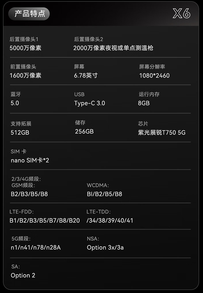 后置摄像头:50MP + 20MP 夜视(或测温枪)