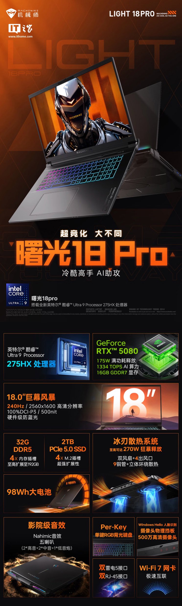 IT之家 3 月 4 日消息,机械师现已在京东上架 2025 款曙光 18 Pro 笔记本,该机搭载 Ultra 9-275HX 处理器、32GB RAM 和 2TB SSD,可选 RTX 5080 / RTX 5090 版本,价格暂未公布,官方称系列笔记本将于 3 月 31 日首销。