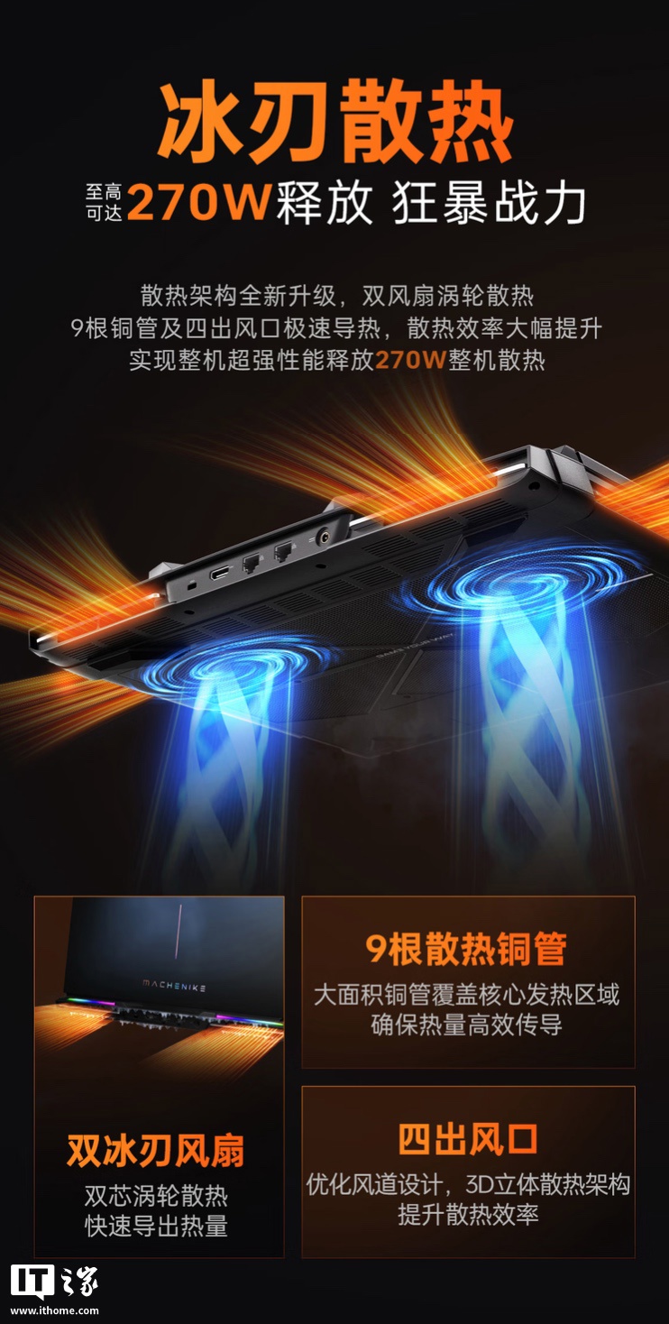 该机配备 24 核心 24 线程英特尔酷睿 Ultra 9-275HX 处理器,配备 32GB DDR5 RAM 和 2TB PCIe 5.0 SSD,可选 RTX 5080/5090 显卡,机身配备双风扇九铜管四出风口散热。
