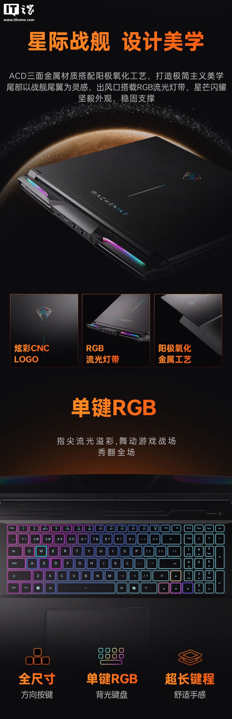 外观方面,该机使用“星际战舰”设计,ACD 三面采用金属材质搭配阳极氧化工艺,出风口配备 RGB 灯;笔记本键盘配备单键 RGB 灯;笔记本配备 5 扬声器,内置 98Wh 电池。