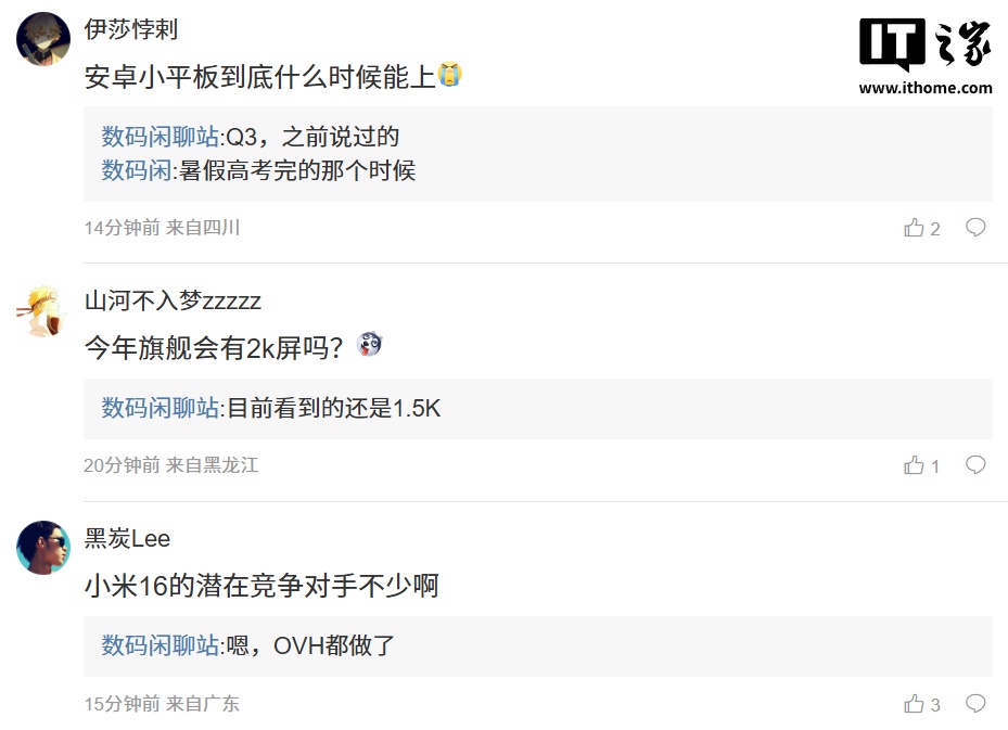 博主还在评论区回复了部分网友的问题:针对安卓小平板上线时间,博主回复“Q3,之前说过的”;针对今年旗舰手机是否会配备 2K 屏,博主表示“目前看到的还是 1.5K”;针对其它厂商是否会推出小米 16 竞品类产品,博主称“嗯,OVH 都做了”。