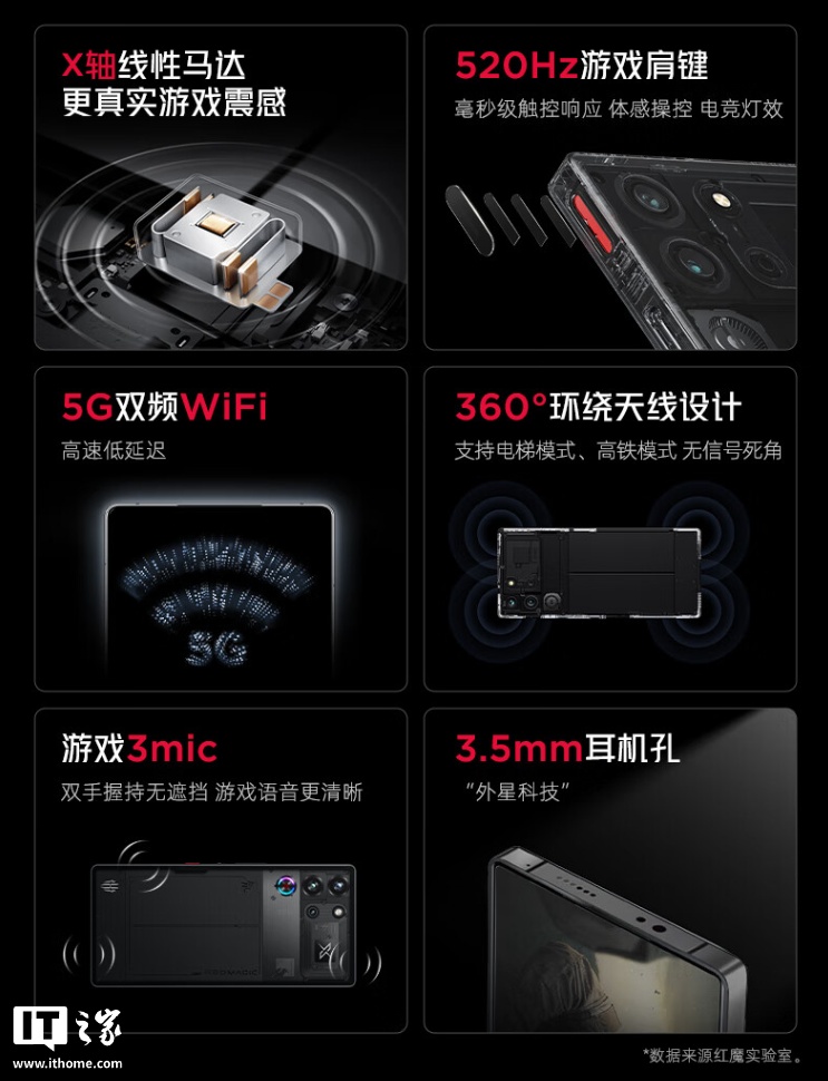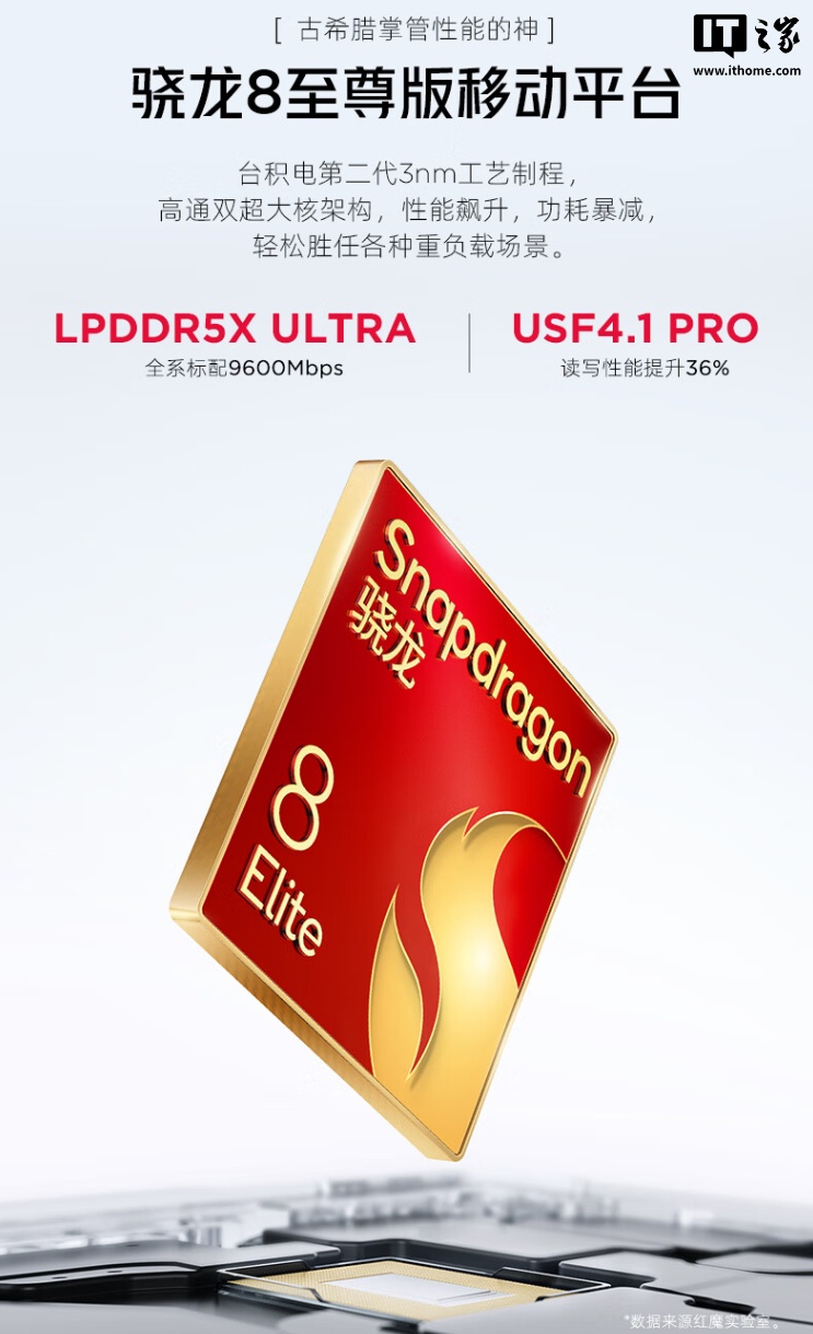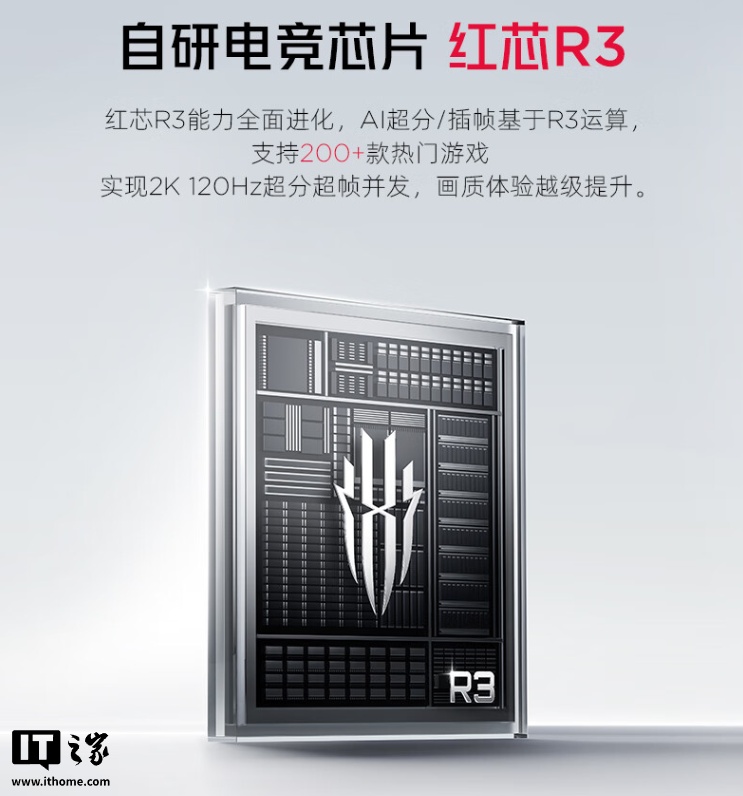 红魔 10 Pro 系列手机搭载高通骁龙 8 至尊版处理器,全系标配 9600Mbps “LPDDR5X Ultra”内存、“UFS 4.1 Pro”存储。此外,新机还搭载红芯 R3 自研电竞芯片,支持 2K+120FPS 超分超帧并发,支持 200+ 游戏。