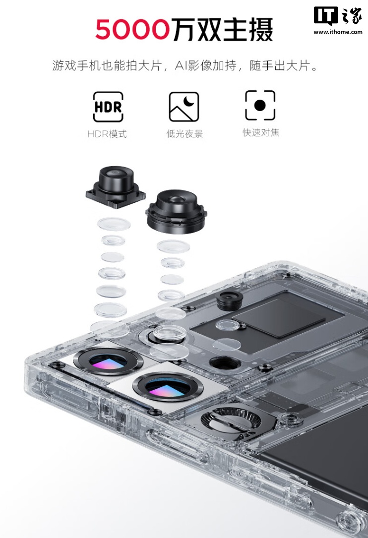 红魔 10 Pro 系列手机前置 1600 万像素摄像头,支持新一代 AI 屏下摄像技术;后置两颗 5000 万像素摄像头(主摄 1/1.55 英寸、超广角 1/2.88 英寸)、一颗 200 万像素微距摄像头,支持低光夜景、快速对焦、HDR 模式、AI 消除、AI 相册搜索等功能。