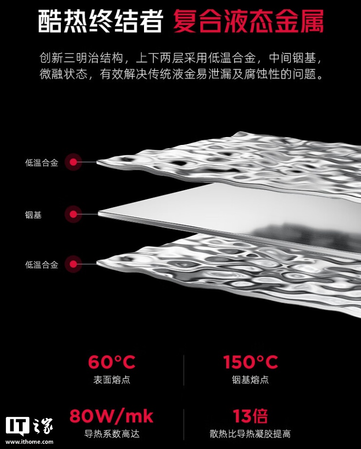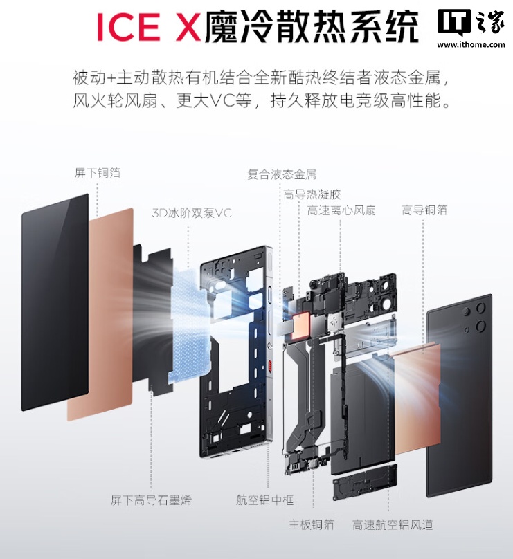 红魔 10 Pro 系列手机首发“复合液态金属”,导热系数 80W / mk,相比导热凝胶提高 13 倍;采用全新“风火轮”高速离心风扇,风速提升 10%,达 23000 转 / 分;3D 冰阶 VC ⾯积提升 18% 至 12000mm²、5200mm² 超导铜箔、屏下石墨烯厚度增加 30%。