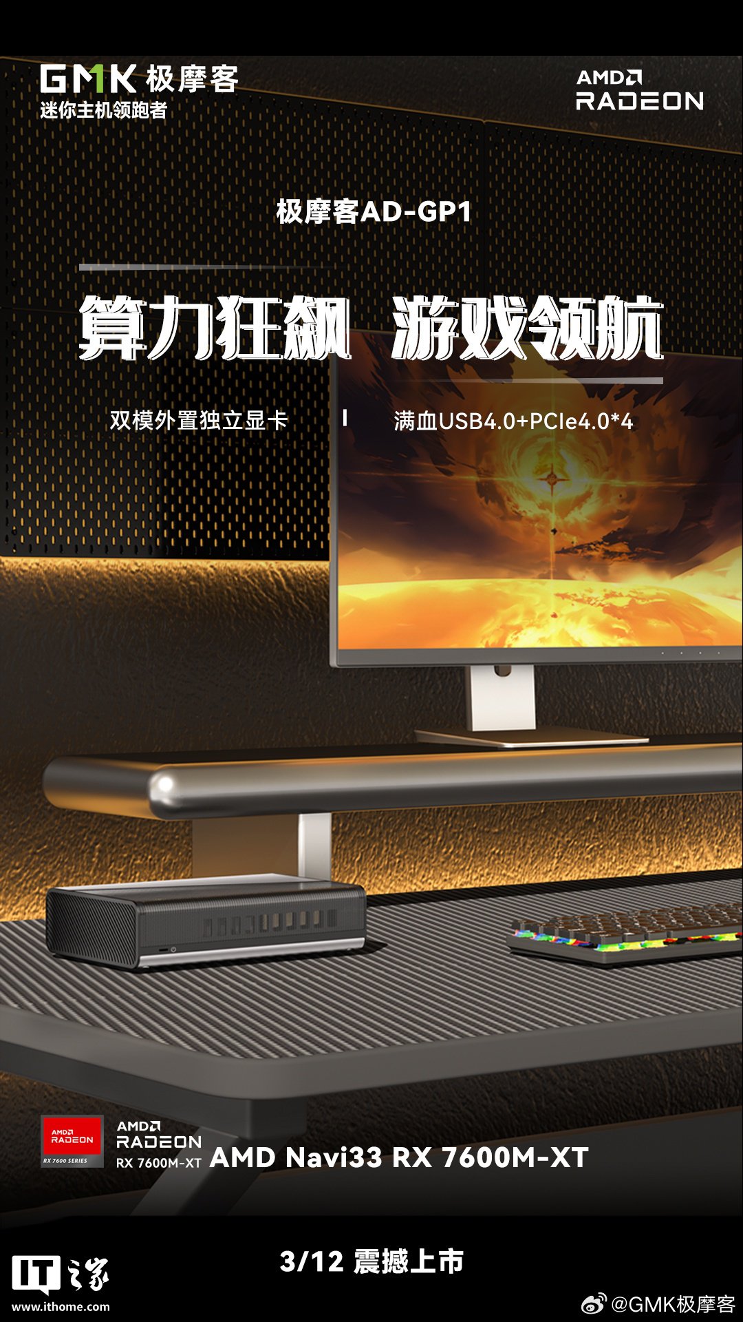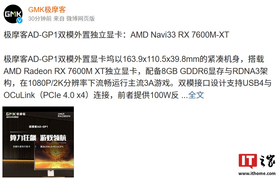 IT之家 3 月 5 日消息,极摩客 AD-GP1 双模外置独立显卡今日正式亮相,其采用 163.9×110.5×39.8mm 紧凑机身设计,搭载 AMD Radeon RX 7600M XT 独立显卡,将于 3 月 12 日正式上市(具体售价未公布)。