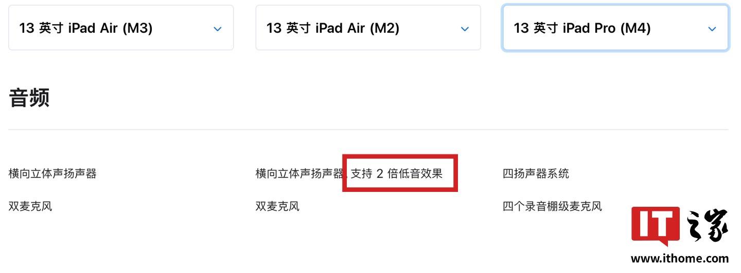 IT之家参考机型对比页,13 英寸款 M3 款 iPad Air 平板电脑取消了扬声器“2 倍低音效果”特性,而该特性实际上在上一代 M2 iPad Air 中才引入,苹果全系 iPad 产品线中有且仅有 13 英寸的 M2 款 iPad Air 支持。
