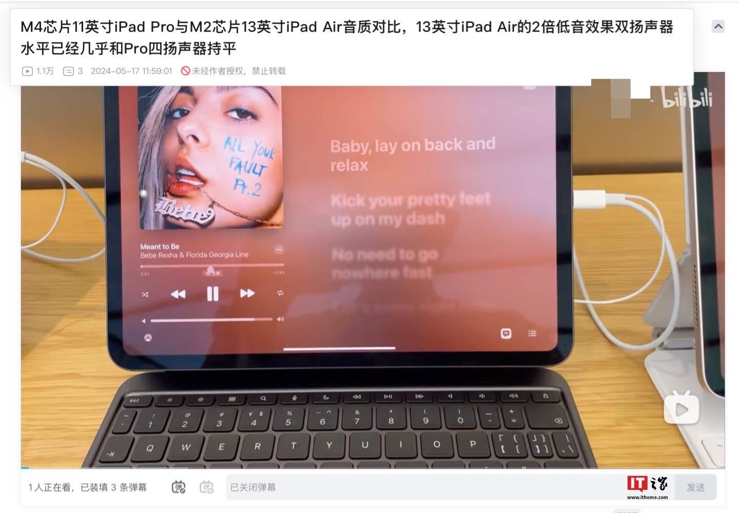 而参考视频平台,有购买 13 英寸 M2 iPad Air 的用户声称“M4 芯片 11 英寸 iPad Pro 与 M2 芯片 13 英寸 iPad Air 音质对比,13 英寸 iPad Air 的 2 倍低音效果双扬声器水平已经几乎和 Pro 四扬声器持平”,但具体效果还需用户自行上手实际评判。
