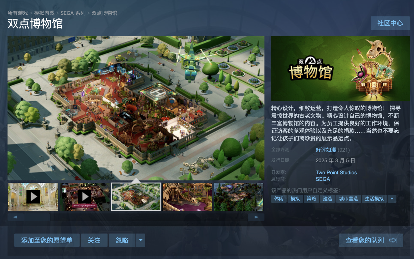 IT之家 3 月 5 日消息,策略游戏《双点博物馆》现已在 PC、PS5、Xbox Series X|S 平台发售,游戏支持简体中文,支持手柄游玩。Steam 国区标准价 158 元,探索者版 198 元,截至IT之家发稿,游戏好评率 96%“特别好评”。