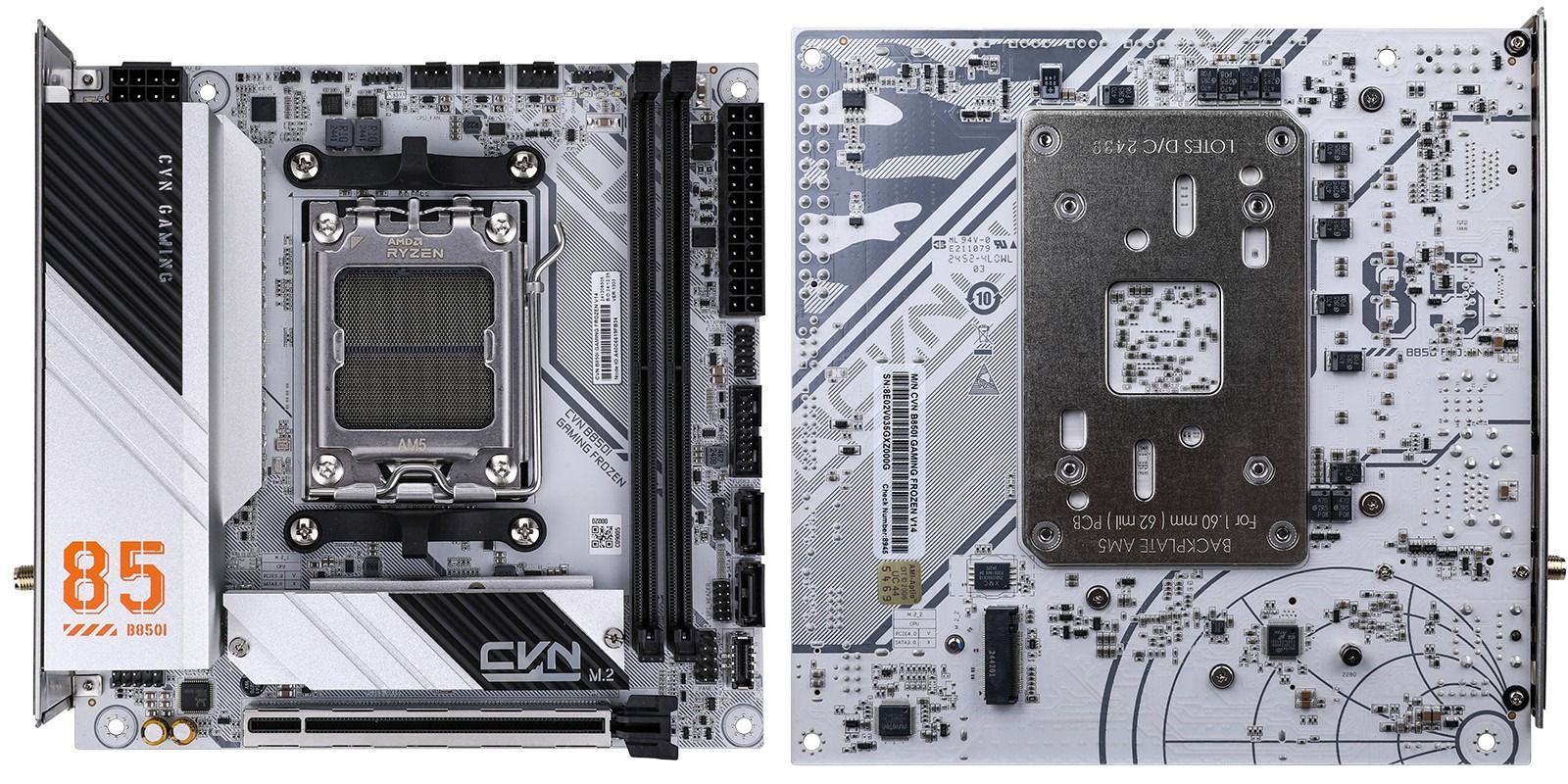 CVN B850I GAMING FROZEN V14 由七彩虹台北研发中心打造;其 VRM 和主 M.2 盘位的散热马甲采用融合简约几何斜线与军工元素的装饰设计,内置 CNC 复合散热沟槽。