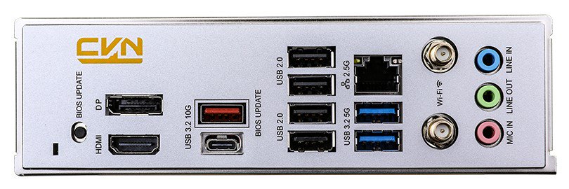 后置接口:1× HDMI 2.0、1× DisplayPort 1.2、1× USB-C 10Gbps、1× USB-A 10Gbps、4× USB-A 480Mbps、2× USB-A 5Gbps、1× 2.5GbE RJ45、3× 音频插孔。