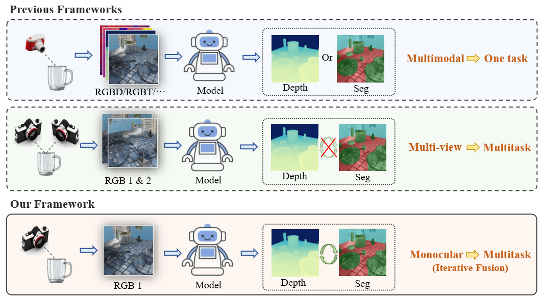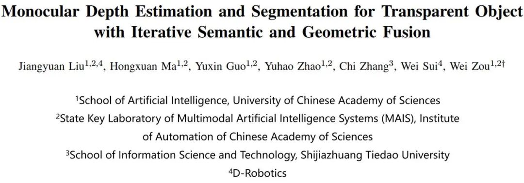 为了解决透明物体的抓取问题,地瓜机器人联合中科院自动化所(简称:CASIA)多模态人工智能系统全国重点实验室,推出了针对透明物体的单目深度估计和语义分割的多任务框架(简称:MODEST)。该框架借助创新性的语义和几何融合模块,结合独特的特征迭代更新策略,提升了深度估计和语义分割的效果,尤其在抓取成功率和系统泛化性方面取得了突破性进展。