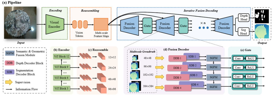 MODEST 模型的整体架构如图所示,输入为单目 RGB 图像,输出为透明物体的分割结果和场景深度预测。网络主要由编码、重组、语义几何融合和迭代解码四个模块组成。输入图像首先经过基于 ViT 的编码模块进行处理,随后重组为对应分割和深度两个分支的多尺度特征。在融合模块中对两组特征进行混合和增强,最后通过多次迭代逐步更新特征,并获得最终预测结果。