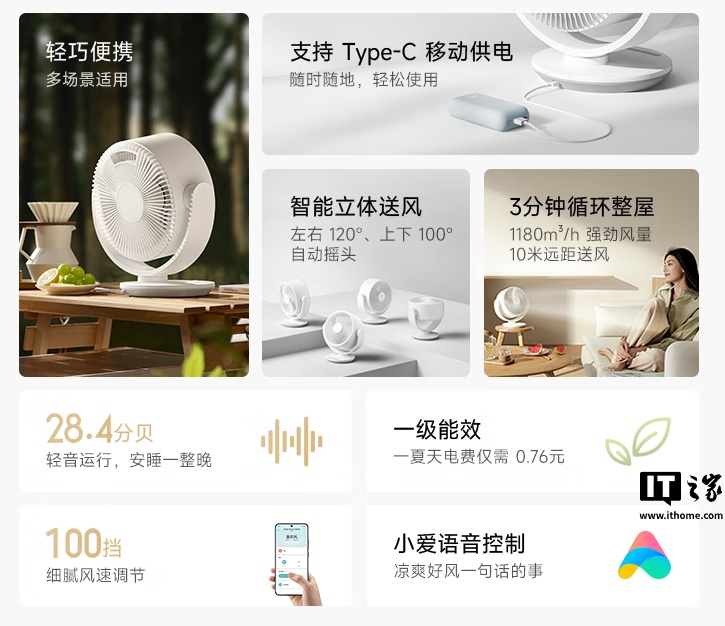 商品页面显示,这款新品体积小巧、不占空间,后置便携提手。产品采用 Type-C 通用接口,多种供电方式,可用标配 18W 适配器为风扇供电,还可用充电宝供电。