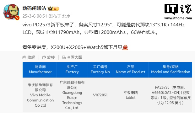 IT之家 3 月 6 日消息,一款型号为 PD2573 的 vivo 平板于近日通过 3C 认证,备案尺寸 12.95 英寸。据博主 @数码闲聊站 透露,其可能是前代那块 13"3.1K+144Hz LCD 屏幕,额定电池 11790mAh,典型值 12000mAh±,66W 有线充。