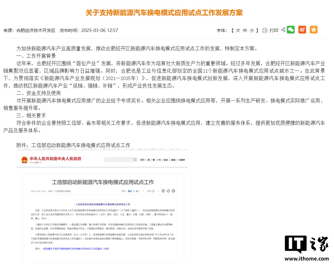 IT之家 3 月 6 日消息,安徽省合肥市经济技术开发区管理委员会今日发布公告,宣布将对开展新能源汽车换电模式应用推广的企业给予专项奖补。